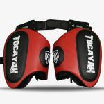 Tocayah KH 1.0 Red Thigh Pads are perfect for training Muay Thai and kickboxing athletes. This equipment provides heavy duty protection to the pad holder’s upper legs. The exterior of these pads is use Premium Microfiber Leather, with four layers interior padding system. The combination of firm exterior padding, and soft inner padding, maximizes the shock absorbency of these thigh pads.